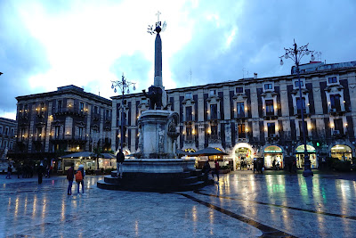 Decidem să lăsăm vulcanul pentru ultima zi și să începem cu orașul gazda. Pornim la pas încă din seara în care am ajuns. O ploaie măruntă se pornește că de nicăieri. Ne face să ne gândim dacă nu cumva, din pură întâmplare, am ajuns la Londra. De fapt, abia acum ne explicăm prezența umbrelelor lăsate de Alessandra într-un coș la intrarea în apartament. Ce contează? Nu e frig, nu ne sperie pe noi o ploicică. În 5 minute, termină și Al de Sus dușul. Ne pornim la fotografiat. Nici una nu dă glas gândurilor: nu pare centrul, pare un fel de Gara de Nord. Din cauza oamenilor străzii. Și a mirosului înțepător de urină. Înaintăm pe bulevardul lor principal. Multe magazine, mulți italieni. E mai micuț decât Bari. Și parcă și mai cochet. Cu ochii după arhitectură și nori, ajungem în Piața Domului. Aci tronează în toată splendoarea-i Fântâna Elefantului cu obeliscul egiptean. Și Domul. Ne învârtim nițel printre ele. Obiective ale turiștilor de peste tot. Până ni se face foame. Hai să găsim niște fructe de mare, într-o osterie din asta cu iz de plajă. Îmda, peste două ore. Că până la 19, suntem în siesta. Îmda, uitasem.