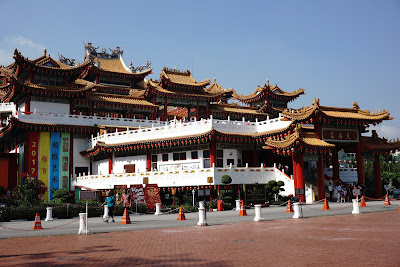 Ne îndreptăm spre Templul Thean Hou. Cunoscut ca și Templul Zeiței Cerului. De ce o fi ales ghidul nostru fix templul ăsta? Păi, e unul dintre cele mai vechi și mai mari temple din Asia de Sud Est, și mai este și așezat pe un deal de unde orașul se vede în întregime. În templu avem și o pagodă budistă, iar întregul așezământ este o îmbinare de elemente budiste, taoiste și confucianiste. În grădina templului sunt îngrijite plante medicinale, iar lângă templu este un arbore sacru Boddhi. Nu-i de mirare că este un loc extraordinar de căutat de localnicii chinezi din Kuala Lumpur pentru a-și oficializa căsătoriile. Numai cât timp am stat noi acolo am văzut vreo trei nunți. Și o grămadă de turiști plus localnici care ardeau bețe și aduceau ofrandă la picioarele statuetelor.