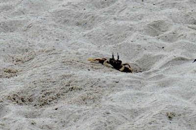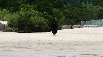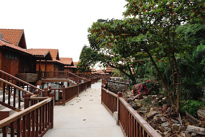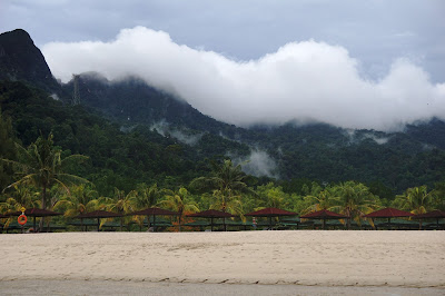 În buna desfășurare a lucrurilor și întru respectarea ad litteram a planului mai sus enunțat, era timpul să mâncăm. Aci, în resort, avem 4 restaurante, 1 lounge, 3 baruri. Hai spre restaurantul de lângă recepție că la ăla sigur știm să ajungem. Pornim pe jos, de teamă să nu ne facem de băcănie când chemăm trocariciul. Tot răul spre bine. Drumul ne ia o oră. Nu din cauză de distanță. Din cauză de fotografiat și minunat la fiecare floare/chalet/maimuță/insectă. La recepție, dăm peste pliante în care ni se recomandă ce să facem pe insulă dacă nu vrem să rămânem la prăjit. Ca peștele, de! Oooo, da, sigur voi cheltui ceva galbeni numai să nu mă perpelesc de pe-o parte pe-alta. În restaurant eram așaaaa, o pată de culoare cum ar fi. Că uitai să vă spun: Malaezia e o țară musulmană, așadar toți ai lor se simt suficient de confortabil să vină aci în insulă să facă plajă îmbrăcați. Greșit, corect este: îmbrăcate. Și uite cum iese iar la suprafață incultura mea și lipsa de acceptare și mă trezesc zgâindu-mă cum se zgâiește un puradel de vreo trei ani pe o plajă de nudiști. Numai că eu mă zgâiam la o tanti îmbrăcată într-o burqa, mâncând o supă. Să ne ferească Ăl de Sus, indiferent cum s-o numi El: lua lingura cu supă, ridica puțin vălul, introvâra lingura, lăsa jos vălul. Și tot așa. Plecai ușor șocată, gândindu-mă ce aveam oare să văd la plajă, dacă la masă se chinuiau așa.