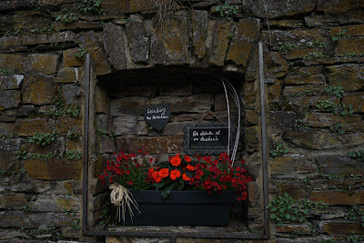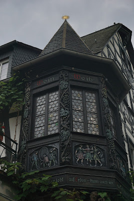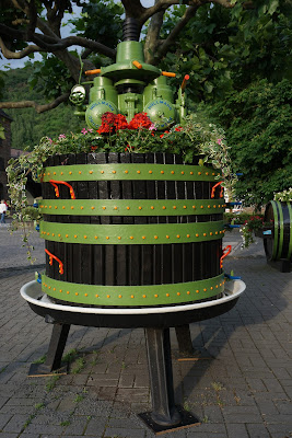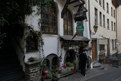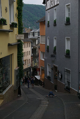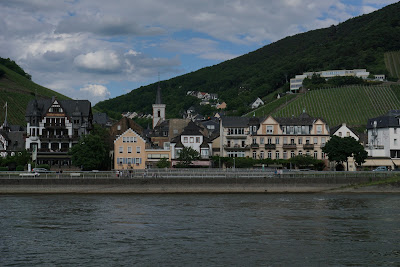 Jos, în Assmannshausen, alte momente de încântare. Trecem pe lângă case pitorești, pe străzi care încalcă orice intimitate a vecinului de peste drum. Oare cât o costa o casă din asta plină cu flori și dătătoare de viață? M-aș putea apuca de magiun. Că la noi, magiunul se face și din must. Și nici nu aș vrea vreun lux. Strictul necesar. Și aș mai putea să spăl vase. Că am ojă semipermanentă. M-aș băga chiar și la cules de struguri, eu care am fugit mâncând pământul de zeama lipicioasă și târâtul pe genunchi de la o buturugă la alta. Hai, vezi-ți de drum! Aci nu se face magiun, vasele le spală mașina și strugurii sunt culeși de ceva mecanisme automate. Ce să-i faci? Mă și imaginam cu vreun neamț blond alături într-o căsuță din asta care te tentează să muști din ea, organizând vacanțe aci la noi, în mijlocul viei.