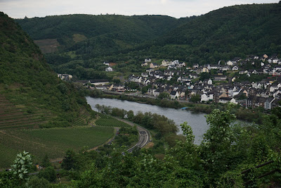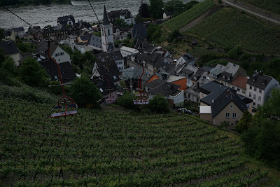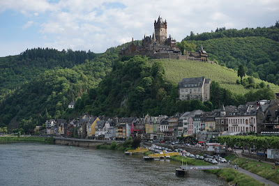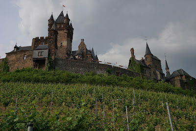 După o înghețată dătătoare de energie, pornim spre domnia sa, castelul. Până să ajungem să ne bucurăm de priveliștea din vârf, ne bucurăm de drumul șerpuindo-urcând, brăzdat de pensiuni și restaurante unde te poți delecta cu ceva degustări de Riesling. Imediat ce începem să urcăm, dăm cu privirea de întinderi întregi de viță de vie. E iunie, încă nu avem struguri copți. Cu toate astea, imaginea este într-adevăr demnă de poză. Deasupra viilor tronează domnia sa. Deasupra și la propriu și la figurat. Reichsburg-ul stă cocoțat în moțul dealului, la o altitudine de peste 100 de metri deasupra râului Mosel. Bună totuși decizia de a merge pe jos și de a ne bucura de tot ce înseamnă rigurozitate nemțească. Parcă și mușcatele cresc la linie, doar doar nu or strica bunul mers al treburilor.