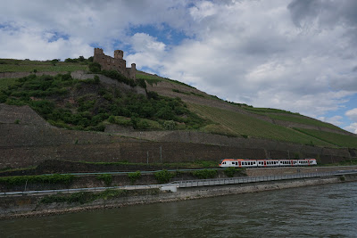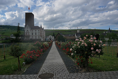 Plecăm înapoi cu vaporul. Pe Rin. Fiecare deal pe lângă care trecem are propriul lui castel. Pe fiecare mal al Rin-ului se întind sate cochete. E un traseu dumnezeiesc. Unde nu e castel, e viță de vie, frumos așezată pe rânduri perfect aliniate. Unde nu e nici castel nici viță de vie, e pădure. Pădurea de multe ori e traversată de tren. Și unde nu e nici pădure, sunt trandafiri. De fapt, trandafirii sunt de multe ori și în capul viei, cam cum sunt la noi ciulinii. Mini croaziera asta pe Rin îl ajută pe Sonică să își pună la bătaie lentilele. Și să scoată în evidență nori, case, apa. Tot acum la întoarcere vedem că pe undeva, pe la intrarea în Rudesheim este un loc extrem de interesant cu o alee de trandafiri care îți sare în ochi dincolo de clădiri și struguri. Aveam să aflăm, luând-o la pas într-acolo, că este crama Carl Jung. Probabil una dintre cele mai admirate și fotografiate crame, datorită atât trandafirilor mai sus amintiți cât și clădirii în sine ce pare mai degrabă un castel.