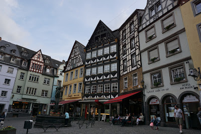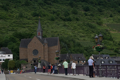 Lăsăm mașina într-una din parcările de lângă gară și pornim să vedem cum e cu castelul Reichsburg. Ne luam și noi după turiștii care se înghesuie toți la cârnați și înghețată. Și uite așa ajungem în centru. Până să urcăm la castel, ne plimbăm nițel pe podul ce duce la mănăstirea Capucinilor. Flori și vii. Asta vedem în fața ochilor. Că uitai să zic de viile care urcă frumos așezate pe fiecare deal care împrejmuiește orașul. Pe străzi, butoaiele care nu servesc drept masă mâncătorilor de cârnați, sunt suport pentru flori. Butoaie, ca să ne amintim că suntem într-o zonă viticolă. Moselul taie orașul în două, echilibrând totuși ambele maluri cu clădiri colorate, străzi înguste și podgorii.