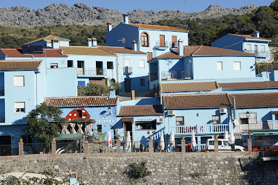 Juzcar, the smurf Village, a fost prima oprire din săptămâna spaniolă. Atunci când m-am gândit la pe unde ar fi fain să ne plimbăm aparatele de fotografiat mi-a atras atenția satul ăsta albastru. Nu știam de treaba cu ștrumfii. Asta am aflat pe urmă. Inițial, mă gândeam doar că ar fi foarte tare să te plimbi pe străduțele unui sat de cer. Cum nu au fost voturi împotrivă și nici abțineri, l-am trecut ca deschizător de drumuri de vacanță. Am ajuns în sat după vreo 10-12 opriri pe marginea drumului ca să îl pozăm de departe. Opririle astea toate în cei 800-850 de metri pe care îi aveam de parcurs de la casa unde am dormit până în mijlocul satului. La primele 8 opriri satul părea mai degrabă alb, de am și zis în gând “să vezi că ăștia ne păcăliră și, în urma vreunei ploi, s-a dus naiba albastrul de pe pereți.”
