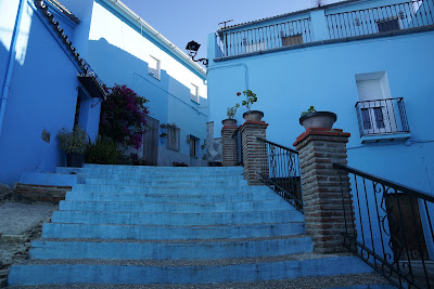 Pornim într-un mod haotico-organizat să îl străbatem. Da, domne, e albastru. Pe unele case sunt pictați ștrumfi. Pe altele sunt pictate flori. Altele chiar au flori la ferestre. La colț de stradă găsești chiar și câte o casă ștrumfească sub formă de ciupercă. Prima pe care am văzut-o era locul destinat punctului de informare turistică. Cred că era prea dimineață de nu era nimeni acolo. Nu că ar avea ce mari informații să îți dea. În maxim 2 ore străbați fiecare străduță cu tot cu pozele pe la fiecare casă. În continuare oamenii își vopsesc casele în albastru. Sau refac vopseaua. I-am văzut în plină acțiune. Sunt încă un pic stângaci când vine vorba de relația cu turistul. Deși eram câțiva rătăciți în dimineața zilei de 25 octombrie care căutam să descoperim care e treaba cu mititelul ăsta situat în Valle del Genal în Serrania de Ronda. În fine.