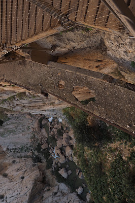 De frumos, e extrem de frumos. Să mergi suspendat, legat pe stâncă. Și să te bucuri de peisaje de calendar. Și de vânt în plete pe podul suspendat. Nu pot să vă descriu senzația că practic, în două secunde, am traversat podul. Nici la poză nu am vrut să stau. Că era un vânticel așa care îl legăna într-un mod dușmănos. Sau așa am simțit eu. Fetele din grup păreau mega încântate și au pițiponcit la poză minute bune. Până ne-a ajuns din urmă celălalt grup care intrase la jumătate de oră după noi.